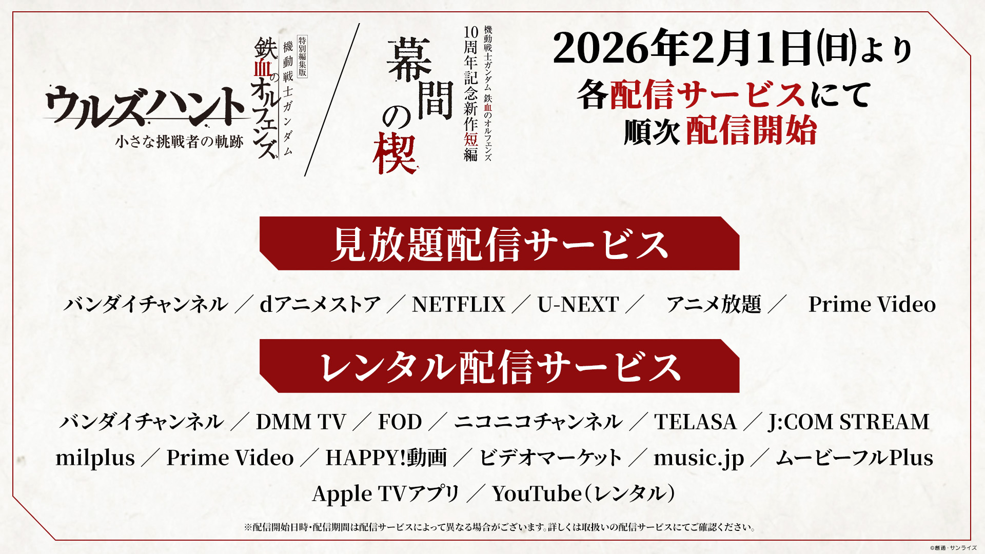 特別編集版『機動戦士ガンダム 鉄血のオルフェンズ ウルズハント -小さな挑戦者の軌跡-』/同時上映作品『機動戦士ガンダム 鉄血のオルフェンズ』10周年記念新作短編「幕間の楔」の見放題配信・レンタル配信が2月1日(日)より順次配信開始となる。