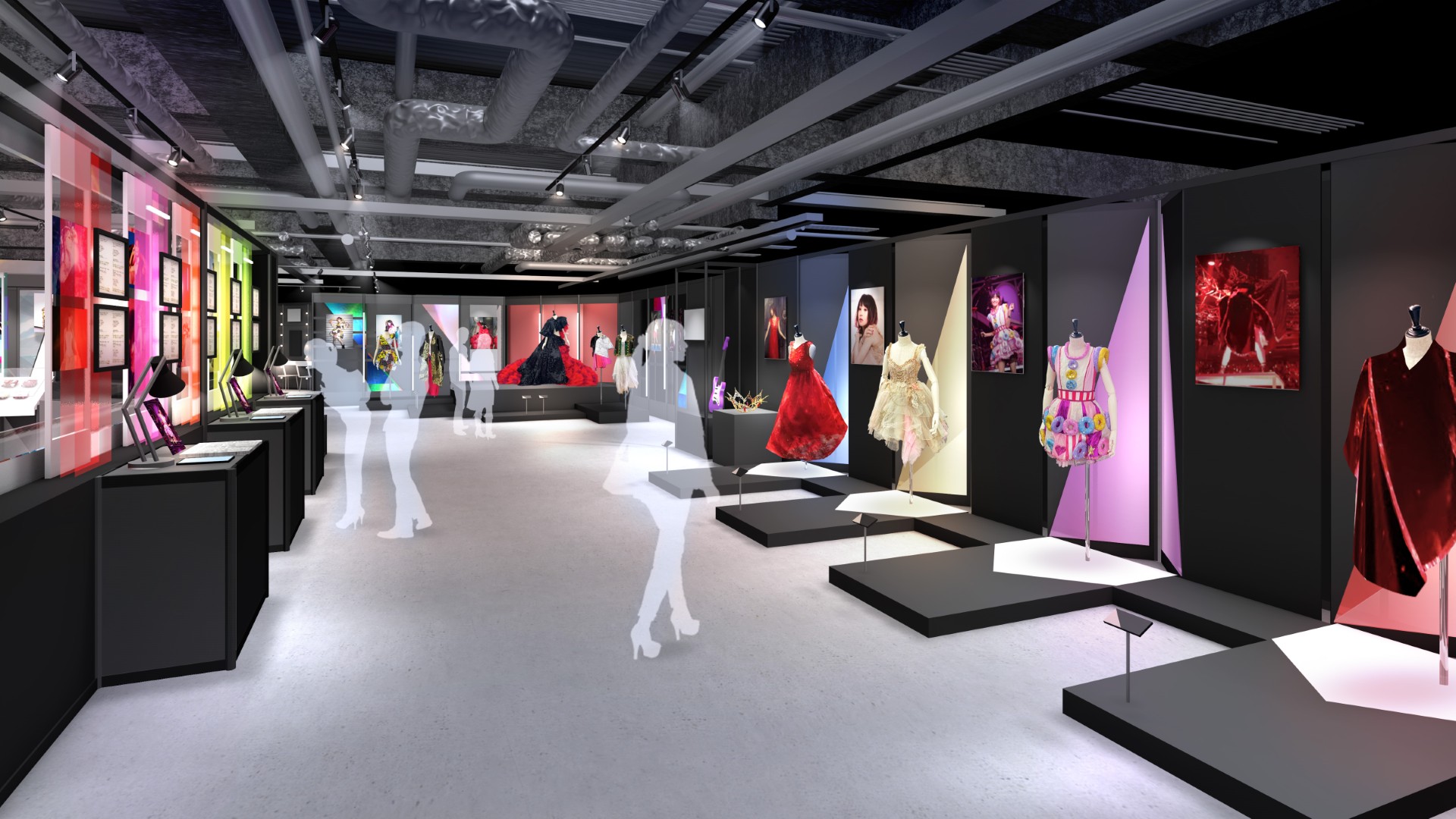 本ゾーンでは、ステージ衣装を年代別に展示し、ステージパース、直筆セットリスト、MC資料とともに紹介します。