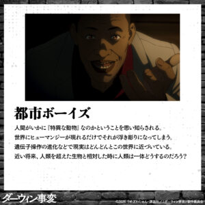 今回、本日2月10日(火)より「レッド・ピル銃撃事件編」の幕開けとなる第6話「直接行動」の放送を目前に、TVアニメ『ダーウィン事変』への著名人からのオピニオンコメントが公開となった。