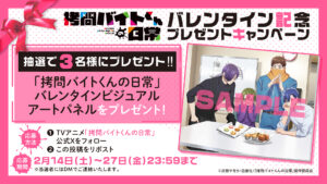 アニメ公式Xをフォローし、該当の投稿をリポストした方から抽選で、「拷問バイトくんの日常」バレンタインビジュアルのアートパネルを3名様にプレゼント!