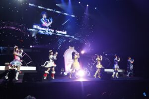 続いて『ここからは私ともっと盛り上げていくわよ!』とチィが登場するやいなや、客席一面の赤色の光に紫色の光が加わり、それを目にしたビビアンチィの2人は、さらに熱いパフォーマンスで会場を盛り上げました。曲中ではビビがチィへ『チィちゃん!大好きー!』と愛をぶつけ、チィも『ありがと』と返す様子に会場もほっこり笑顔に。
