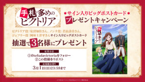 アニメ公式Xをフォロー&該当の投稿をリポストした方を対象に、ビクトリア・セラーズ役・安済知佳、ノンナ役・若山詩音、ジェフリー・アッシャー役・阿座上洋平サイン入りティザービジュアルポストカードを3名様にプレゼントしますので、ぜひご参加ください。
