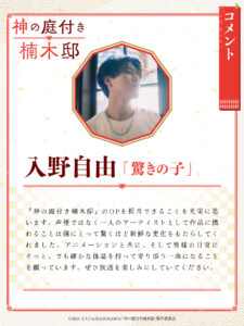 『神の庭付き楠木邸』のOPを担当できることを光栄に思います。声優ではなく一人のアーティストとして作品に携わることは僕にとって驚くほど新鮮な変化をもたらしてくれました。