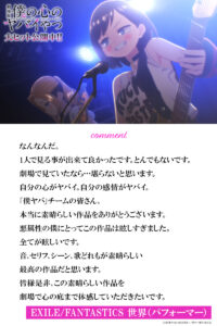 なんなんだ。1人で見る事が出来て良かったです。とんでもないです。劇場で見ていたなら…堪らないと思います。自分の心がヤバイ。自分の感情がヤバイ。「僕ヤバ」チームの皆さん、本当に素晴らしい作品をありがとうございます。悪属性の僕にとってこの作品は眩しすぎました。全てが眩しいです。音、セリフ、シーン、歌どれもが素晴らしい最高の作品だと思います。皆様是非、この素晴らしい作品を劇場で心の底まで体感していただきたいです。