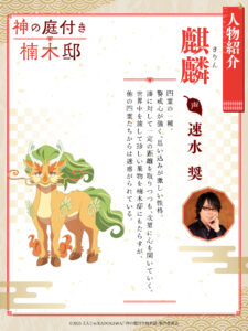 吉祥をもたらす四種の瑞獣(四霊)。楠木邸の池に住みつき、湊に幸運をもたらす存在。日本酒が大好きで、しばしば酔いどれることも。穏やかでのんびりした性格。