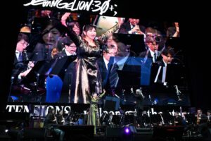 2日目となる2月22日(日)は、日本で毎公演チケット完売するほどの高い人気を誇り、昨年、韓国や北米での公演でも、スタンディングオベーションの大成功を収めてきた「エヴァンゲリオン」ウインドシンフォニーの生演奏でスタート。天野正道が指揮を務め、「E-9(A STEP FORWARD INTO TERROR)」や「E-06(ANGEL ATTACK)」など、『エヴァンゲリオン』シリーズを彩ってきた劇伴の数々を重厚な演奏で披露した。シリーズで生まれた数々の名シーンを思い起こさせる、勇壮で壮大なパフォーマンスで一気に会場中を感動に包みこんだ。1曲終えるごとに会場中が拍手喝采となり、目に涙を浮かべるファンたちの姿も見られた。その後、ステージには高橋洋子が笑顔で登場。