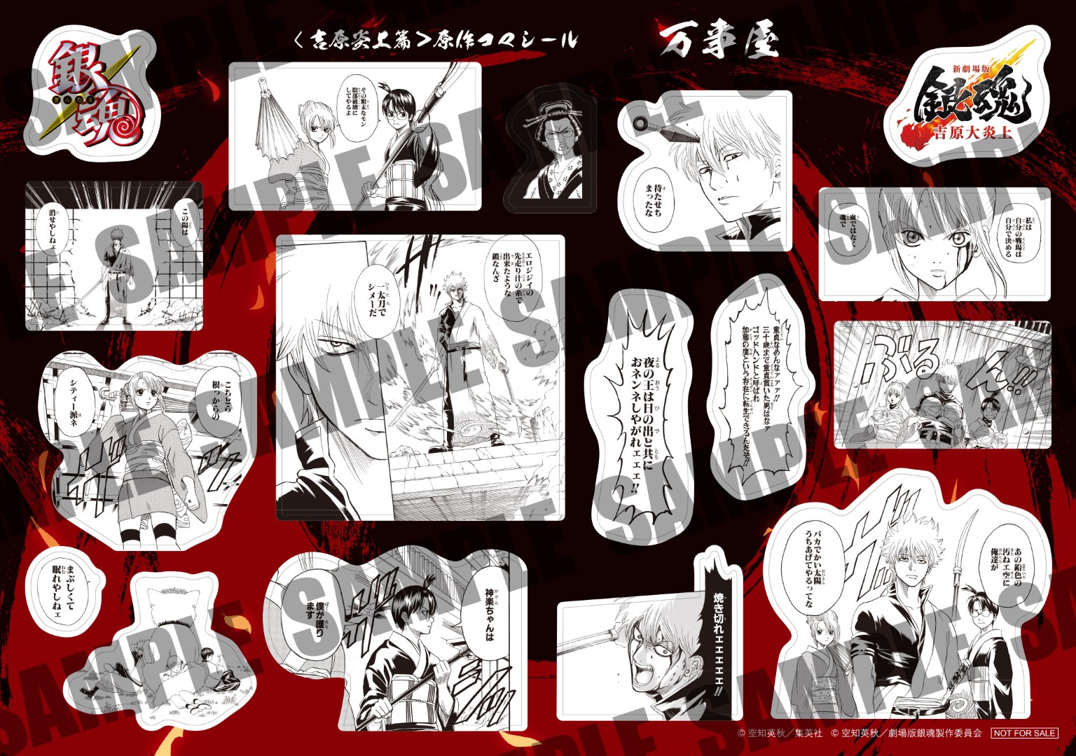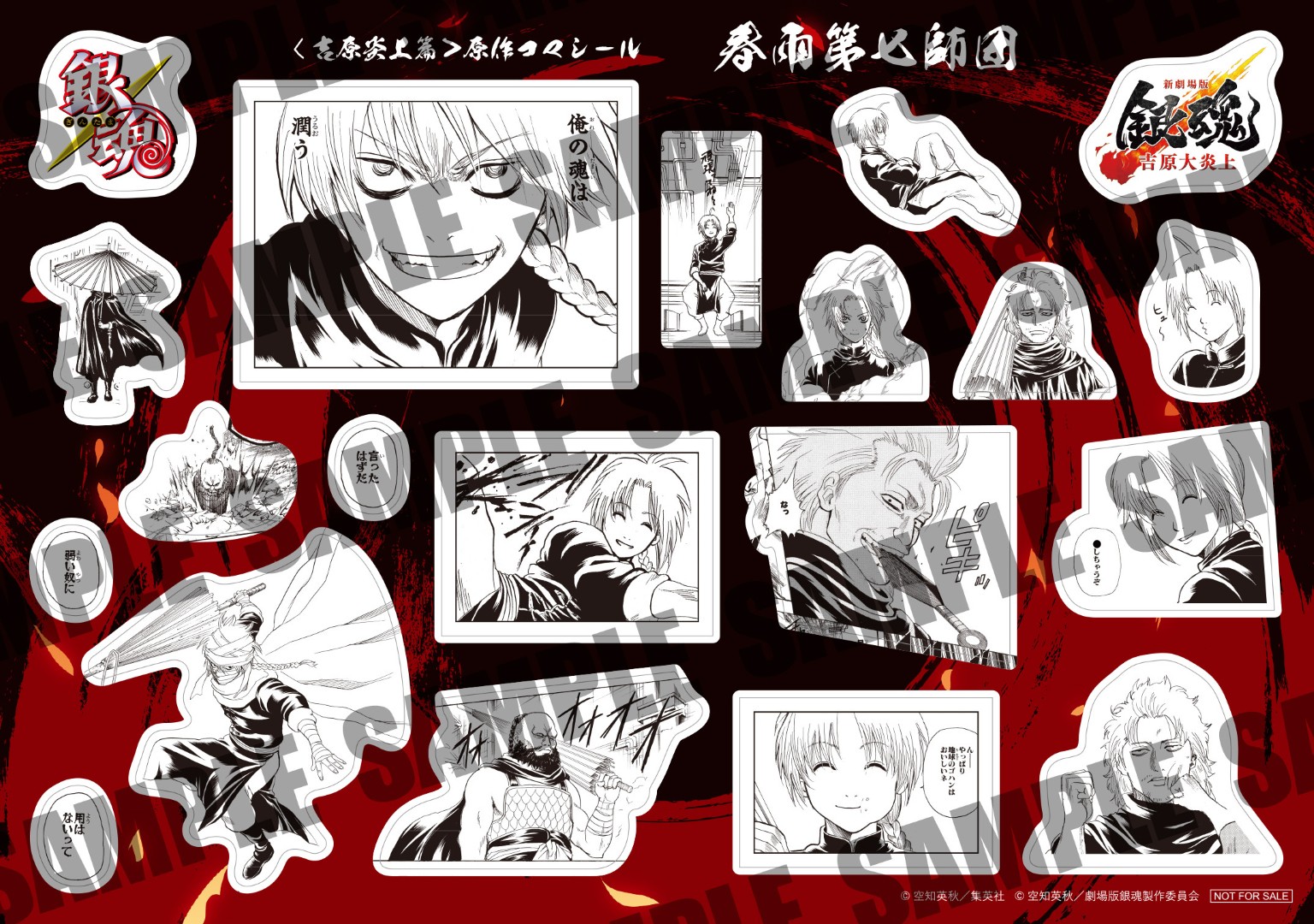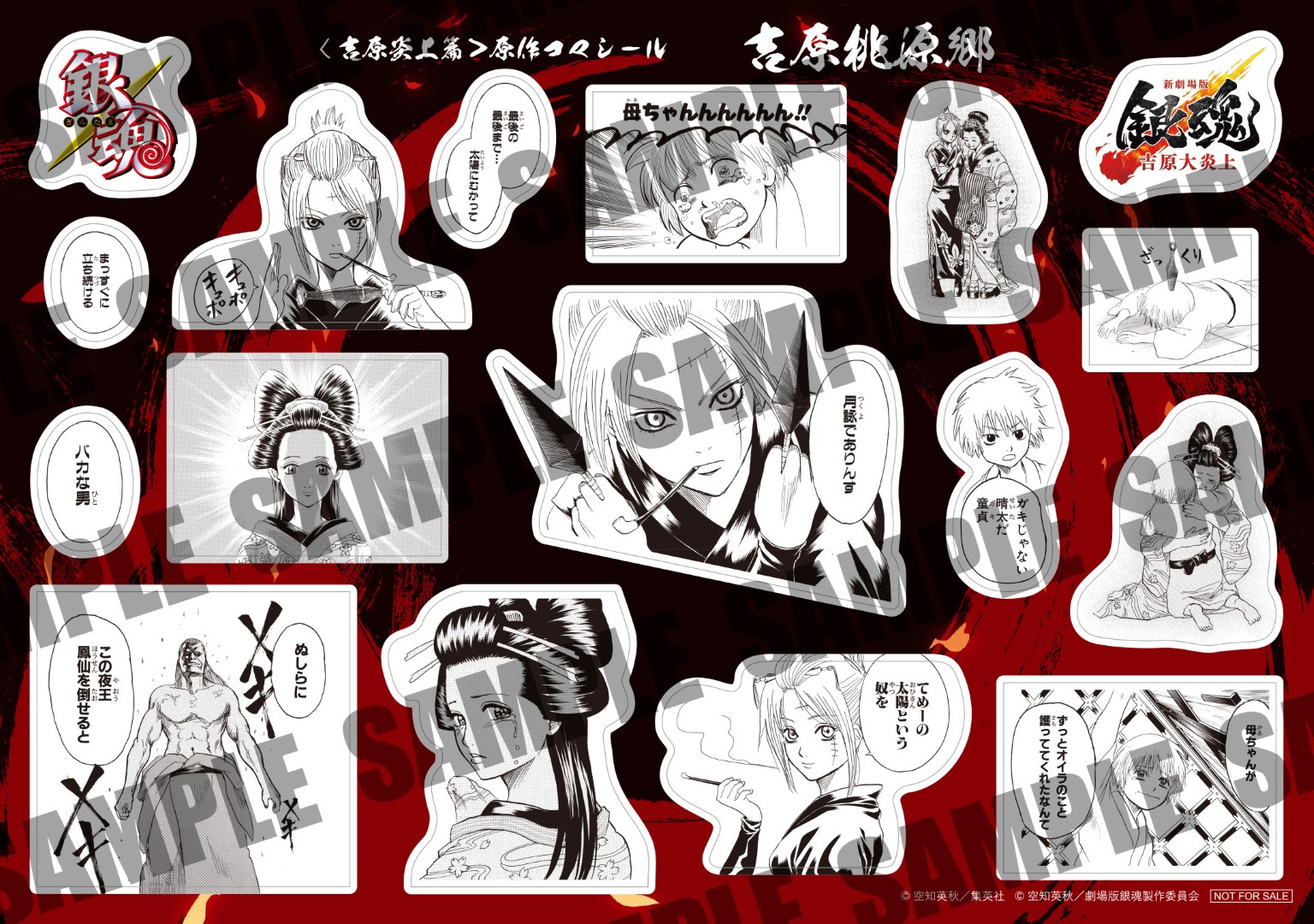 シールには、晴太のために決死の覚悟で立ち上がる万事屋の面々をはじめ、吉原で対峙する神威や阿伏兎の熾烈な戦闘モード、そして、日輪や月詠の姿を凝縮。さらに、真選組や桂率いる攘夷党のシールには、お馴染みの名シーンや桂とエリザベスの勇姿が捉えられており、「吉原炎上篇」初め原作の名場面を集めたファン必携のシールとなっている。映画館へ急げ!なくなり次第終了だァァァ!!まだまだ続く入場者特典をお見逃しなく!