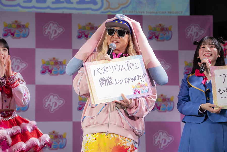 その後、DJ KOOが「アイプリ」のゲームやアニメで象徴となっている、ライブのクライマックスで衣装が光り輝く『バズリウムチェンジ』を生体験。『バズリウムチェンジ』をしたDJ KOOは「キラキラ光っていくというのは気持ちも上がるので!最高DO DANCE!テンションMAX!」と場を盛り上げた。