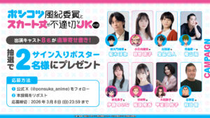 公式Xにて、桜大門統悟役の榎木 淳弥さん、小日向微笑役の明智 璃子さん、出淵遊役の堂島 颯人さん、月島聖一役の福山 潤さん、秋名素子役の伊藤 ゆいなさん、田崎類役の福原 綾香さん、大和撫子役の甲斐田 裕子さん、古郡薫役の稲田 徹さんの8名の寄せ書きサイン入りメインビジュアルポスターが当たるプレゼントキャンペーンを開始!