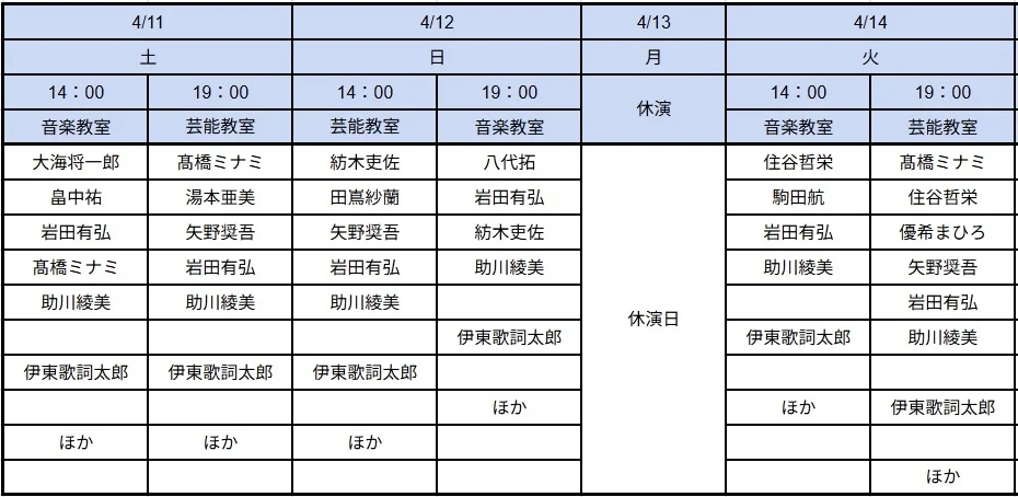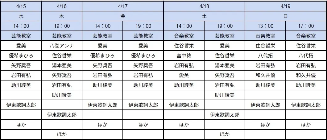 脚本:【音楽教室】鈴木智晴(劇団東京都鈴木区)/【芸能教室】守山カオリ(Bobjack Theater)