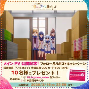 メインPV公開を記念して、漫画喫茶「ヘッジホッグ」の会員証風QUOカードが抽選で当たるプレゼントキャンペーンの実施が決定した。