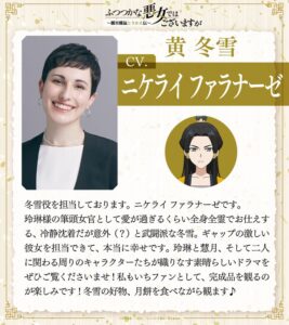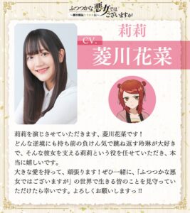 どんな逆境にも持ち前の負けん気で跳ね返す玲琳が大好きで、そんな彼女を支える莉莉という役を任せていただき、本当に嬉しいです。