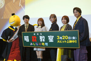 この度、本作の劇場公開初日を記念して、TVアニメ「暗殺教室」の主要キャラクターを演じる福山潤(殺せんせー役)、渕上舞(潮田渚役)、岡本信彦(赤羽業役)、洲崎綾(茅野カエデ役)、逢坂良太(磯貝悠馬役)が登壇する『劇場版「暗殺教室」みんなの時間』の公開初日舞台挨拶を開催!新宿バルト9のメイン会場のみならず、全国約160館へライブビューイング中継を実施。この日を心待ちにしていた全国各地のファンと共に公開を祝い、『アニメ「暗殺教室」10周年の時間』の大団円を飾るにふさわしい、熱狂と大盛況に包まれたイベントとなった。