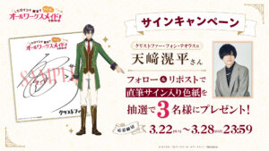 公式Xにて、クリストファー・フォン・テオラス役天﨑滉平さんのサイン色紙が当たるプレゼントキャンペーンを開始いたします!