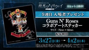 公開9週目となる3月27日(金)より、9週目入場者プレゼントとして、「ガンズ・アンド・ローゼズ コラボアートステッカー」が配布開始となる。
