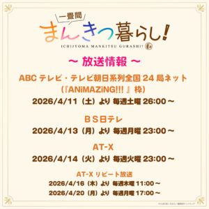 芳文社「まんがタイムきらら」で連載中の『一畳間まんきつ暮らし!』(著:ひさまくまこ)のTVアニメの放送情報の追加解禁や配信情報、AnimeJapan 2026でのSNSキャンペーンの情報などの新規情報が多数公開された。