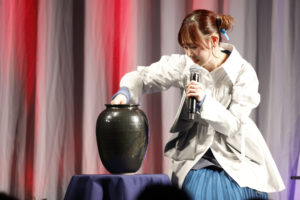 作中で乙弥が背負っている「蠱毒の壺」にちなんで、寺澤さんが壺から登壇キャストの名前が書かれたカードを引き、選ばれた人が『MAO』の魅力について語っていくコーナーだ。