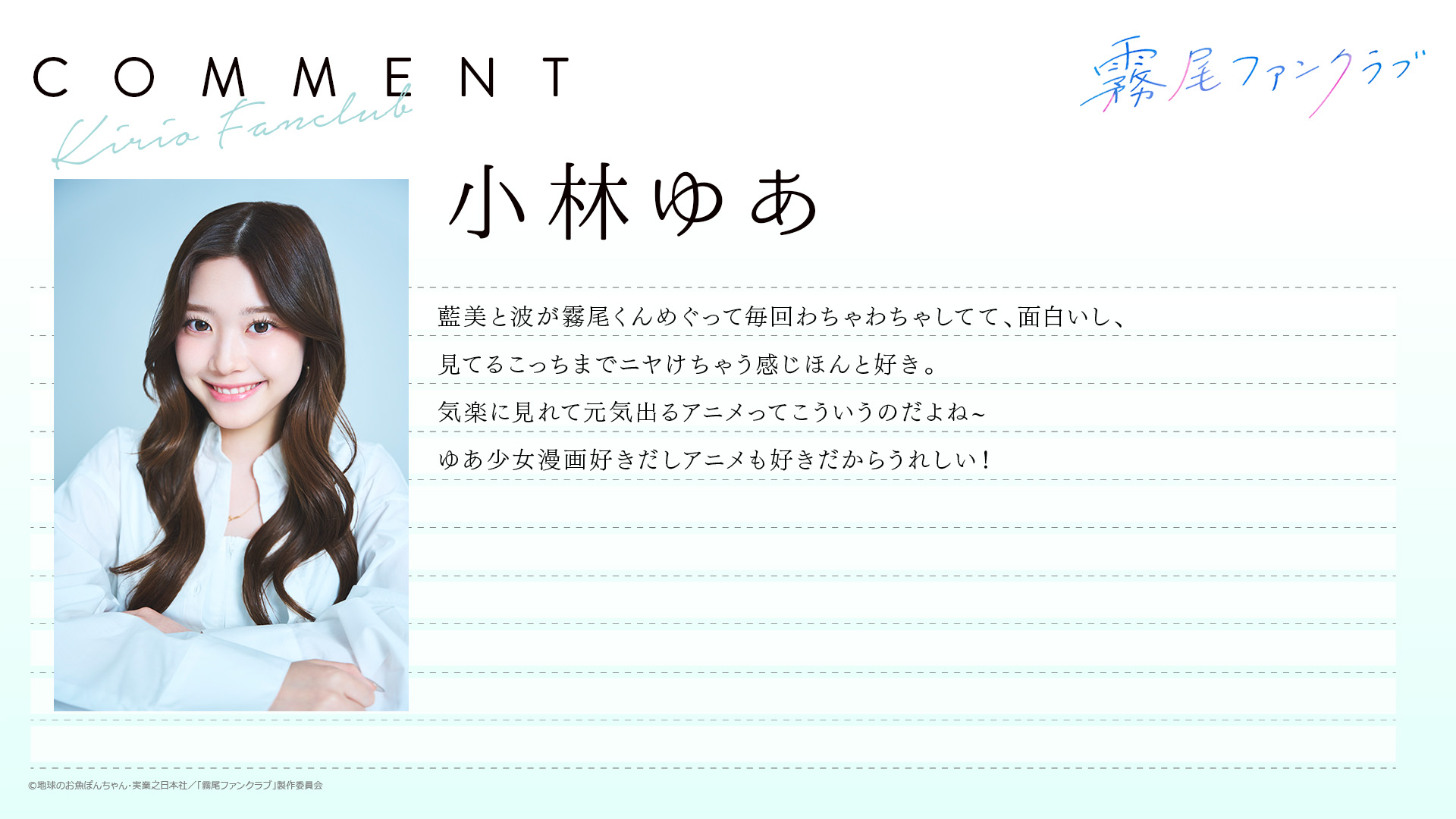TVアニメ「霧尾ファンクラブ」は、MBS/TBS系28局“スーパーアニメイズムTURBO”枠にて2026年4月2日より毎週木曜深夜0時26分から全国同時放送となる。寄せられたコメントを読みながら、アニメ放送をお楽しみにお待ちいただきたい。