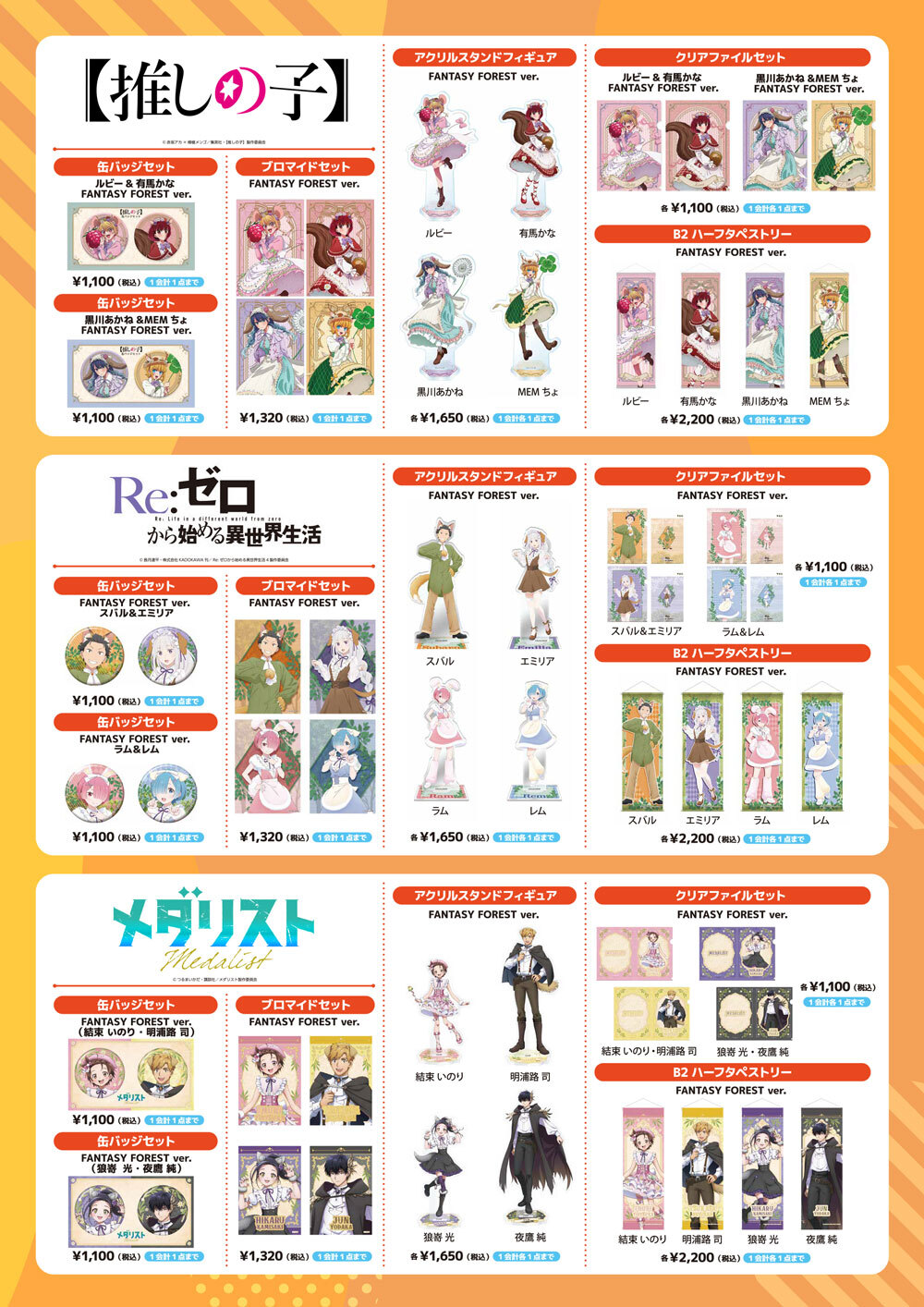 『パンどろぼう』『おでかけ子ザメ』『うごく!ねこむかしばなし』のグッズや、AnimeJapan2026 KADOKAWAブースで販売した『Re:ゼロから始める異世界生活』『【推しの子】』『メダリスト』『ようこそ実力至上主義の教室へ』など、「FANTASY FOREST」がテーマの可愛いイラストのグッズを販売する。