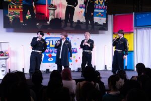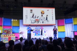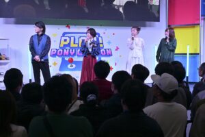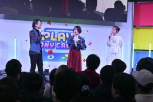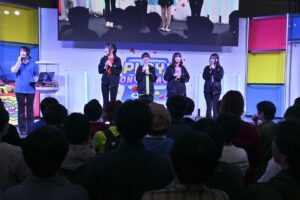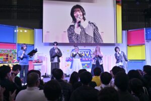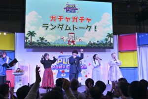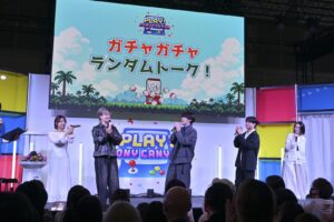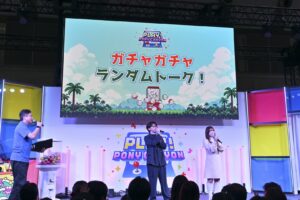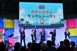 今回のステージのコンセプトは“ゲームセンター”。作品紹介や魅力を伝えるトークのあと、ガチャガチャでトークテーマを決める“ガチャガチャランダムトーク!”と“ステージ対抗!アーケードゲーム対決”(ワニワニパニック)が実施され、わいわい楽しいステージが展開された。その模様をレポートします。