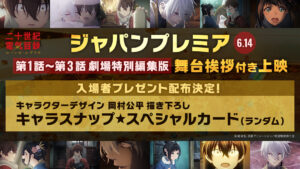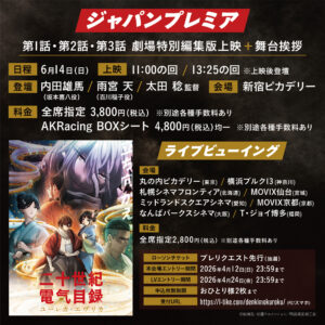 6月14日(日)に新宿ピカデリーを本会場として、全国8劇場でのライブビューイングも実施されるジャパンプレミアでは、劇場公開のために特別編集された第1話・第2話・第3話が上映され、上映後に内田雄馬(坂本喜八役)、雨宮 天(百川稲子役)、太田 稔監督の舞台挨拶が行われる。