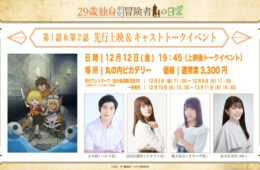 TVアニメ『29歳独身中堅冒険者の日常』キャストトーク付き先⾏上映イベントが開催決定! 2025年12月3日 2026年1⽉より放送予定のTVアニメ『29歳独⾝中堅冒険者の⽇常』が、12⽉12⽇に丸の内ピカデリーで先⾏上映イベントを開催! 第1話・第2話を世界最速で上映されるほか、上映後には、古川慎さん(シノノメ・ハジメ役)、前⽥佳織⾥さん(ナタリー役)、緒⽅佑奈さん(オリーヴ・カルメン役)によるトークショーを実施す... 続きはコチラ2026年冬29歳独身中堅冒険者の日常アニバースイベント情報ニュース