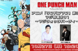 アニメ『ワンパンマン』第3期 古川慎&緑川光出演の特番生配信決定!10月26日(日)放送 #27「生物の限界」あらすじ・場面カットが公開! 2025年10月23日 WEBコミック界のカリスマ・ONE(『モブサイコ100』)とジャンプ最強遺伝子・村田雄介(『アイシールド21』)の超強力タッグで「となりのヤングジャンプ」(集英社)にて連載中の大人気作品『ワンパンマン』。原作コミックスのシリーズ累計発行部数は3,500万部(2025年10月時点/紙・電子合計)を突破した。 ... 続きはコチラ2025年秋アニバースニュースワンパンマン先行カット