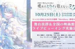 『劇場版プロジェクトセカイ 壊れたセカイと歌えないミク』10月25日(土)丸の内ピカデリーで舞台挨拶&全国の劇場でライブビューイング実施決定! 2025年9月24日 「プロジェクトセカイ カラフルステージ! feat. 初音ミク」(以下、「プロジェクトセカイ」)は、「初音ミク Project DIVA」シリーズを手掛ける株式会社セガと、サイバーエージェントグループの株式会社Colorful Paletteとの協業による、iOS/Android向けリズム&アドベンチャ... 続きはコチラアニバースイベント情報ニュース映画