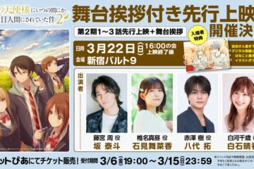 TVアニメ『お隣の天使様にいつの間にか駄目人間にされていた件』第2期 キャスト舞台挨拶付き先行上映会実施決定! 2026年3月6日 「小説家になろう」で2018年12月より投稿され、GA文庫(SBクリエイティブ刊)にて刊行中の大人気ライトノベル『お隣の天使様にいつの間にか駄目人間にされていた件』(著:佐伯さん イラスト:はねこと)。 それを原作としたアニメが2023年1月より第1期が放送され、第2期が2026年4月3日(金)22:30よ... 続きはコチラ2026年春お隣の天使様にいつの間にか駄目人間にされていた件アニバースイベント情報ニュース